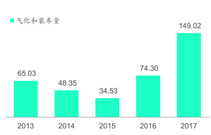 2017年,昆侖能源LNG加工及儲運銷售量159.95億(yì)立方米,較去年同期79.28億立方米增加(jiā)80.67億(yì)立方米或101.75%;完成京唐LNG接收(shōu)站收購,新增接(jiē)收能力650萬噸/年,三個接收站能(néng)力達1900萬噸/年,全年LNG氣化和(hé)裝(zhuāng)車量快速增長,實現氣化裝車量為149.02億(yì)立方米,同比增長101%,負荷率54.9%。
