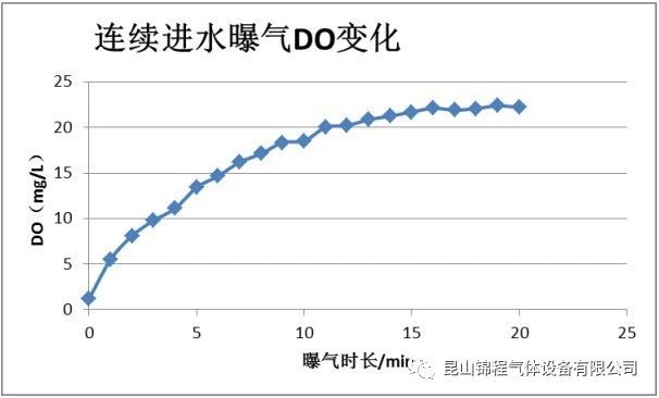 三套數據如下:第(dì)一套產量250M3/h (合同值(zhí)230M3/h),富度83%(合同值80%) ,壓力51kpa。第二套製氧設備參數:產量580M3/h(合同值560M3/h),富度84%(合同值80%),壓力52kpa,第三套製氧設備參(cān)數; 產量710M3/h(合同(tóng)值680M3/h),富度82%(合同值80%),壓力53kpa。當河水(shuǐ)流速較平緩時,COD濃度降低30%~50%;經過曝氣區的BOD/COD值從0.46降至0.40,這表明在富氧曝氣過程(chéng)中不僅發生了硫化物、亞鐵等還原物質的化學氧(yǎng)化(表現為水體黑色變淺,臭味減弱),而且(qiě)發生了一定程度的生(shēng)物降解作用。同時溶解氧的數據(jù)有一定變化,如下圖。由圖可知,連續進(jìn)水曝(pù)氣在0~10min時(shí),溶解氧含量迅速上升,10min之後上升趨勢變慢,在17min之後開始趨於平緩,說(shuō)明溶解氧在水中(zhōng)達到飽和,飽和(hé)值在22mg/L左右。