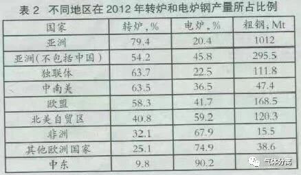 雖然(rán)電弧(hú)爐煉鋼產量沒有超過全球粗鋼(gāng)總(zǒng)產量(liàng)的三分之一(在2012年占(zhàn)29.3%),但由於中國(guó)在世界鋼(gāng)產(chǎn)量的主導地位(占世界總量的46%),且它主要使用氧氣煉鋼,電弧爐煉鋼的影響被(bèi)忽(hū)略,表2顯示(shì)了在2012年不同地區轉(zhuǎn)爐煉鋼及電弧爐煉鋼的相(xiàng)對比例。