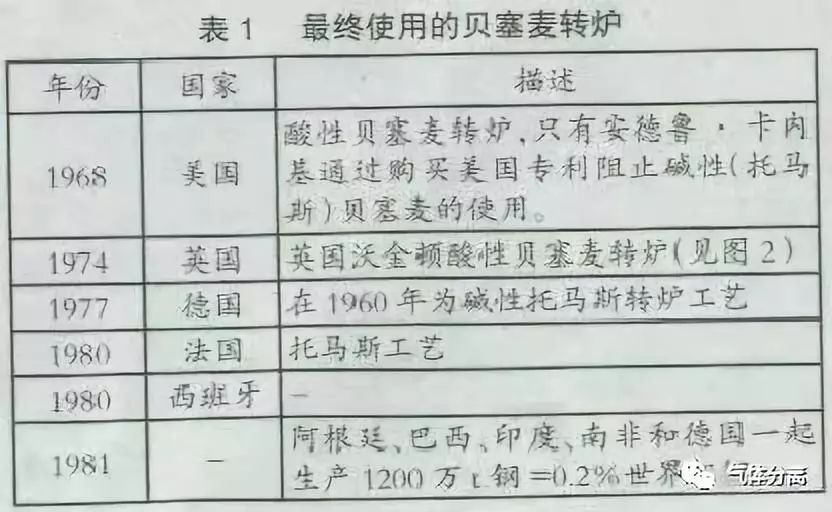 在世(shì)界(jiè)的一些地區氧氣轉爐煉鋼和貝塞麥轉爐一直共存至1981年,但是在歐洲止於19世紀70年代,使用情況見(jiàn)表1。