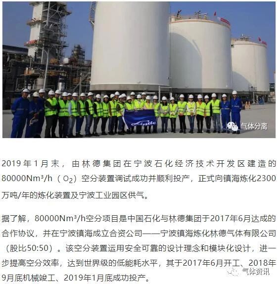 隨著一期項目的投產,二期項(xiàng)目即將展開。在2018年舉行的寧波—德國深(shēn)化經(jīng)貿交(jiāo)流(liú)合作論壇上,林德集團與寧波市鎮海區就林德空分二期項目增資簽署協議,標誌著(zhe)該項目(mù)正式落戶鎮海。該項目總投資近1億美元,協議外資4000萬美元,擬新建兩套單套製氧能(néng)力為100000Nm³/h的空分裝置,並配建後備和附屬設施(shī)。該(gāi)空分裝置主(zhǔ)要生(shēng)產包括(kuò)氧氣、氮氣在內的工業氣體,可有(yǒu)效提升鎮海、北侖、大榭等(děng)區域的供氣可靠性,為寧波綠色石化園區有序安全運行提供有力保障。