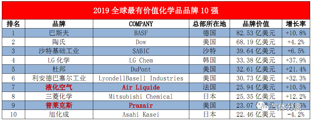 氣體分離2月21日消息,據(jù)英國著名品牌評估機構Brand Finance於本月(yuè)初最新發布的“2019全球最有價值的10大(dà)化學品牌”排(pái)行榜顯示——憑(píng)借著25.94億美元和23.07億美元的價值,液化空氣、普(pǔ)萊克斯成為全球化學品領域最有價值的品牌10強之一(yī)。