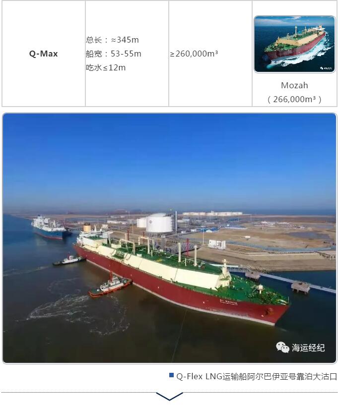 LNG海上運輸因其貿易專(zhuān)屬性,大部(bù)分船舶都航行於固定的幾條航線,同時受靠泊碼頭限製,船舶尺度往往呈係列分布(bù)(見表),習慣上將120000立方(fāng)米到180000立(lì)方米的LNG運輸船稱為常規型,由卡塔爾訂購的(de)兩型(xíng)超(chāo)大型LNG運輸船尺度(dù)分別高達210000立方米和266000立方米,被稱為Q-flex和Q-max。Q-max為現今最大的LNG運輸船型,船長345米,船寬53.8米,吃水12米(mǐ),“Q”代表卡塔爾(ěr)Qatar,“max”代表卡塔爾LNG碼頭(tóu)能夠停(tíng)靠的最大尺寸船舶。