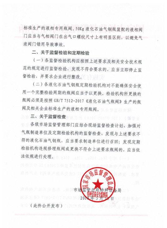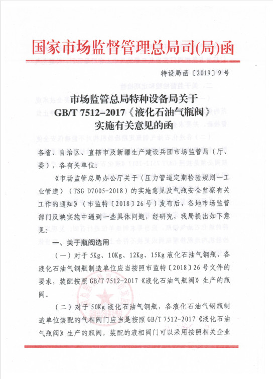 市場監(jiān)管總局特種設備局關於GB/T 7512-2017《液(yè)化石油氣氣瓶閥》實施有關(guān)意見的函(hán)