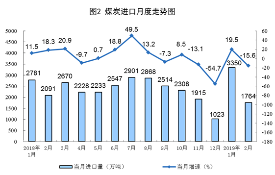 1月份進口煤炭3350萬噸,增長(zhǎng)19.5%;2月份進口1764萬噸,下降15.6%。