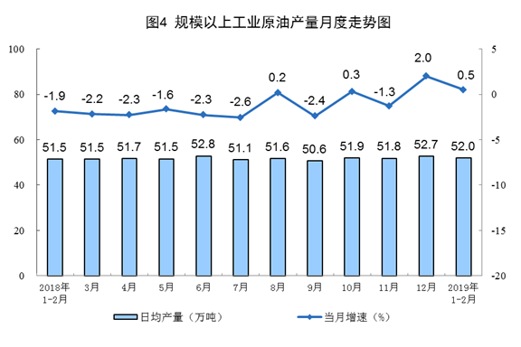 1-2月份,生產原油3069萬噸,增長0.5%,增速比上年12月回落1.5個百分點;日均產量52萬噸。
