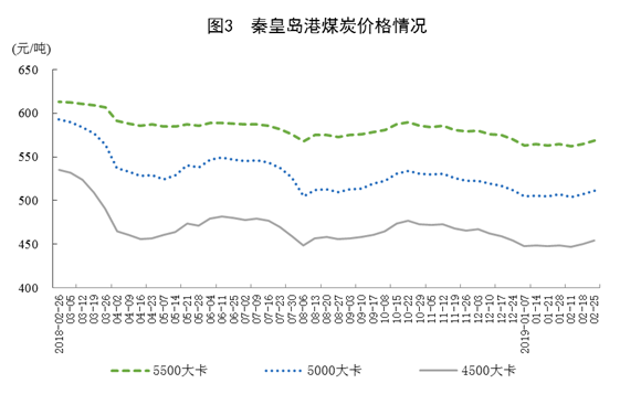 2月25日,秦皇島港5500大卡煤炭綜合交易價(jià)格為(wéi)每噸569元,5000大(dà)卡煤炭每噸511元,4500大卡煤炭每噸454元,均與上年12月24日基本持平。