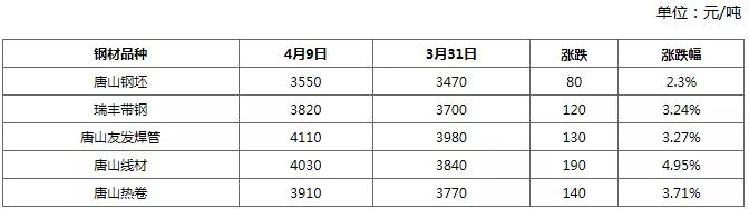 進入4月份,鋼市一改往日震蕩(dàng)徘(pái)徊的慢節奏,迎來了久違的開門紅。據卓創數據統計,截止到從4月1日至今唐山鋼坯累漲(zhǎng)100元,漲幅2.9%;瑞(ruì)豐帶鋼累漲120元/噸,漲幅3.24%。唐山焊管累漲130元/噸,漲幅3.27%;唐山線材累漲190元/噸,漲幅4.95%;唐山熱(rè)卷累漲140元/噸,漲幅3.71%。特別是清明節後(hòu)這兩日,鋼材市(shì)場更是全線(xiàn)拉漲,幅度在50-100元/噸不等。