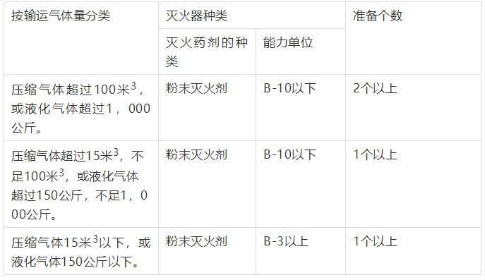 運輸(shū)可燃氣體(tǐ)時,攜帶的消火設備如下表所列,要(yào)安放在可迅速取用的(de)位(wèi)置。