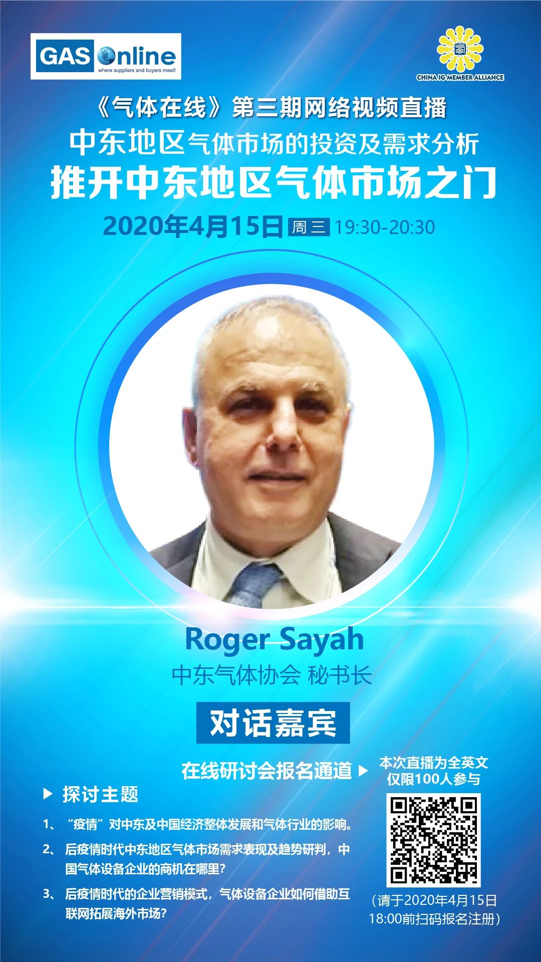 推開中(zhōng)東地區氣體市場之門! 由《氣體在線》-GASonline組織的(de)第三期雲直播視頻研討會--“中東地區氣體市場的投資及(jí)需求分析”將在4月15日晚上19點30分準時開始, 中(zhōng)東氣體協會秘書(shū)長Roger Sayah先生(shēng)將(jiāng)介(jiè)紹(shào)“疫情(qíng)”對中東(dōng)地區經濟整體發展和氣體行業的影響,點評中國氣體設備企業的(de)拓展商機。本次活動每人注冊費200元,僅(jǐn)限100人參與。歡(huān)迎(yíng)點(diǎn)擊下麵的鏈接(jiē),報名確定席位。