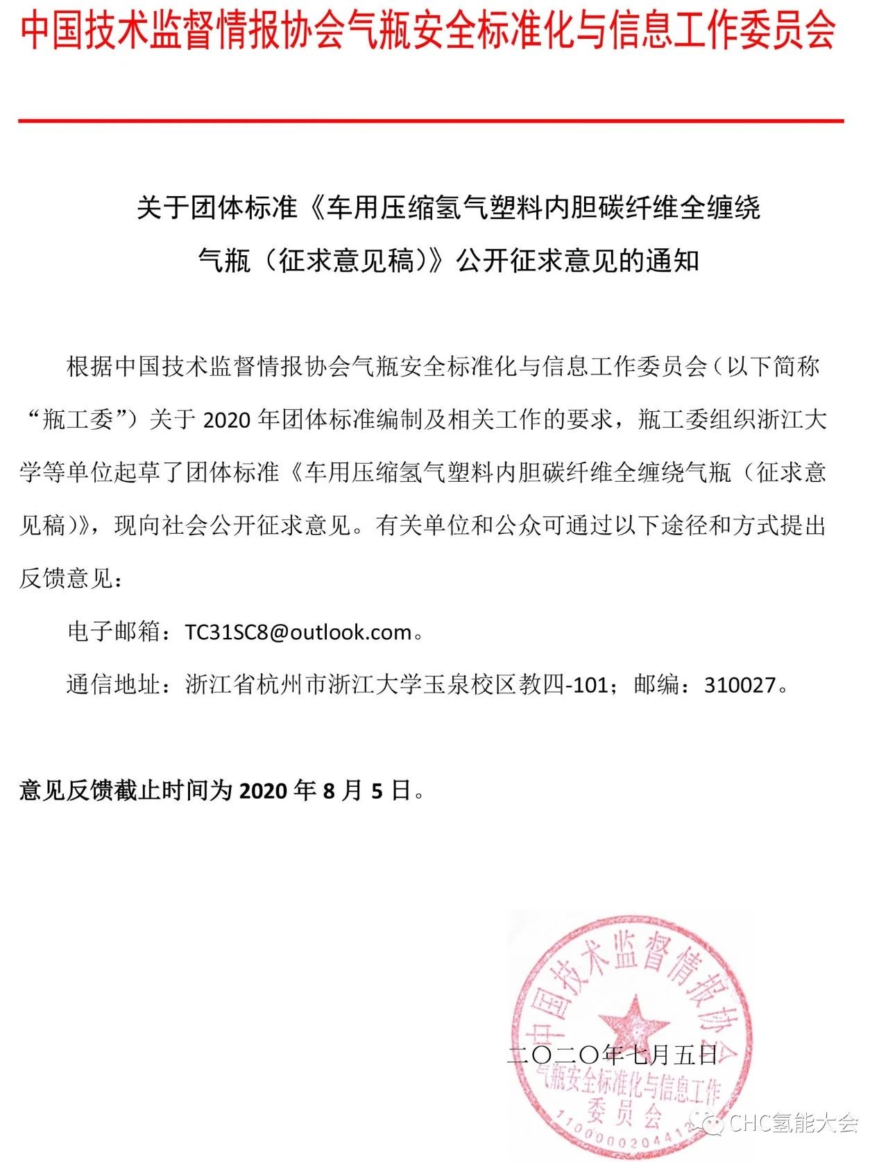 根據中國技術監督情報協(xié)會(huì)氣瓶安全標(biāo)準(zhǔn)化與信息工作委員(yuán)會(以下簡稱“瓶工委”)關於2020年(nián)團體標準編製及相關(guān)工作的要求,瓶工委組織浙江大學等單位起草了團體(tǐ)標準《車用壓縮氫氣塑料內膽碳纖維全纏繞(rào)氣瓶(征求意見(jiàn)稿)》,現向社會公開征求意見。有(yǒu)關(guān)單位和公眾可通過以下途徑和方式提出反饋意見:
