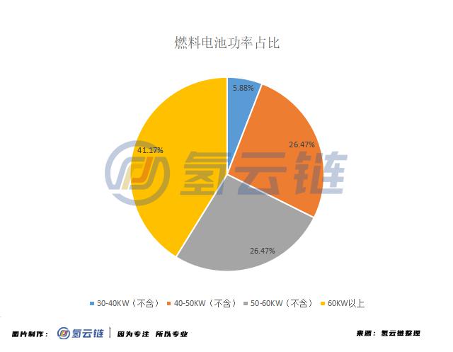 目前功率被認為是燃料電池最重要的指標之(zhī)一。2020 年上(shàng)榜的(de)燃料電池汽車中,40-50KW 的(de)功(gōng)率(lǜ)區間車型數量最多(duō),共 13 款,30-40KW 及 60KW 以上這兩個區間緊隨其(qí)後,均為 9 款(kuǎn)。