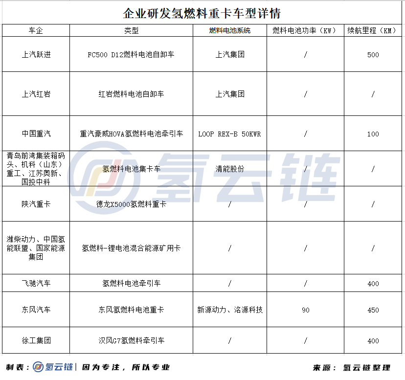 氫雲鏈據公開信息統計到,目前國內車企成功(gōng)開發燃(rán)料電(diàn)池重卡車(chē)型的有上汽、陝汽、中國重汽、飛馳汽車、徐工(gōng)集(jí)團(tuán)等車企;而車型方麵,擁有燃料電池牽引車、自卸車和礦(kuàng)用卡車等;