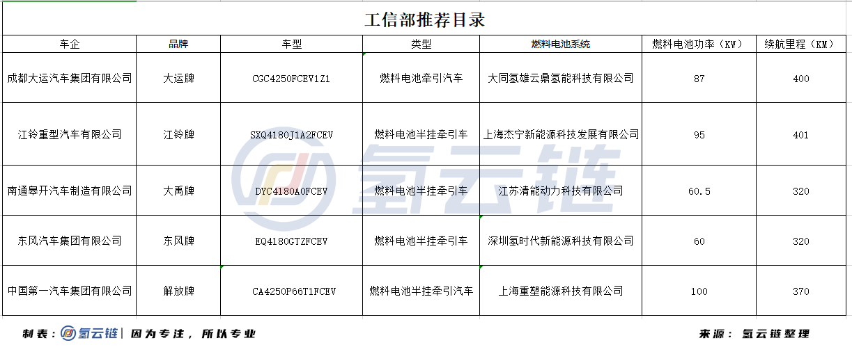 氫雲鏈(liàn)從工信部推薦目錄了解到(dào),目前工信部已經發布的《道路機動車輛生產企業及產品公告(gào)》中,共(gòng)有5款燃料電池(chí)重卡車型上榜,分別為大運(yùn)汽車、江鈴重卡(kǎ)、南通皋開、東風汽車和中國一(yī)汽,分別由大同氫雄、上海傑寧新能源、江蘇清能、深圳氫時代和上海重塑等燃料(liào)電池係統廠家配(pèi)套。