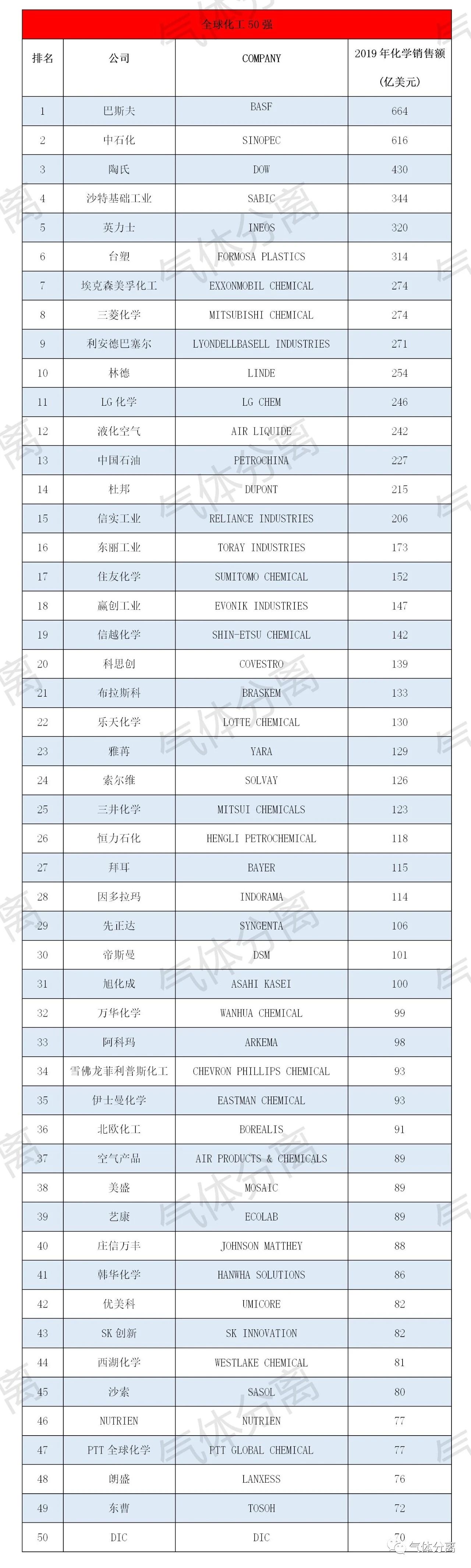 7月27日,美國化學會旗下《化學與工程新聞(wén)》雜誌(C&EN)在其官網發(fā)布了2020年全球(qiú)化工企業(yè)50強榜單(Global Top 50)。C&EN表示,對於(yú)上榜的化工公司來說,2019年的銷售和利潤(rùn)受到打擊,2020年的情況會更糟(zāo)。眾所周(zhōu)知,COVID-19(新冠病毒)大流行使全球經濟陷入數十年來最(zuì)嚴重的衰退,摧毀了汽車、航空航(háng)天和(hé)石油勘探(tàn)等大型化工終端市場。但(dàn)是,根(gēn)據2019財年的數據,C&EN最新發布的全球前50名化學品生產商調查顯(xiǎn)示(shì),在人們聽說(shuō)這種新(xīn)冠病毒之前,經濟活動已經放緩。50強在2019年實現了8556億美元的化工收入,比上年下降5%。收(shōu)益出現了更大幅度的下跌。公布數據(jù)的46家公司的利潤總額為715億美元,比2018年下降28.2%。其(qí)中南非沙索公司Sasol出現了虧損(sǔn),這是多年來50強公司中未曾出現的。收益大幅下降的原(yuán)因是:國際(jì)貿易緊張局勢,經濟放緩以及汽(qì)車製造(zào)業等關鍵市場(chǎng)的疲軟。這些公司今年肯定會麵臨更嚴重的衰退。因為有了(le)新冠(guàn)病毒,汽車行業在第二季度完全停滯不前,油價暴跌,消費經濟遭到重創。美國化學委員會(huì)預計,2020年全球國內(nèi)生產總值(GDP)將萎(wěi)縮4.6%,美國將下降6%。信用評級機構Moody's預測,美國化學製造商的利潤將下降20%。盡管波動很大,但今年C&EN的排名並沒有(yǒu)太大變化。隨著陶氏杜邦的分拆(chāi),巴斯夫重新奪(duó)回頭把交椅;中國(guó)石化排名第二,比上一年提升1位,現在是全球第二大化工公司;第三名為分拆後的(de)陶氏。恒力石化今年首次上(shàng)榜,位居第26位;陶氏杜邦拆分為陶氏、杜邦和Corteva Agriscience。其中,陶氏和杜邦分列第3位和14位。由於林德與普萊克斯(Praxair)合並,排名大幅上升11位,進入前十。2019年是林德與普萊克斯合並成立工業氣體巨(jù)頭後的第一個全年。該公司還超越了液化空氣集團成為世(shì)界上最大(dà)的工業(yè)氣體生產商。合並後(hòu),林德的行動(dòng)一(yī)直比較溫和。與Hyosung合作,該公司將斥資2.45億美(měi)元,於2022年前在韓(hán)國蔚(wèi)山建(jiàn)造(zào)世界上(shàng)最大的液(yè)氫工廠。林(lín)德與巴(bā)斯夫合作(zuò),一直在(zài)研究從51吃瓜网中提取氦氣的方法。該技術使用了贏創工業(yè)公司的聚酰亞胺中空纖(xiān)維分離膜,作為(wéi)回收(shōu)稀有氣體的常規且昂貴的低溫方法的(de)替(tì)代品(pǐn)。林德(dé)與普萊克斯合並後,法國液(yè)化空氣集團不再是全球(qiú)最大(dà)的工業(yè)氣體生產商。但是,兩家公司僅相差10億美元(yuán),因此它們的地位將來很可能會再次發生變化。這家法國公司將斥資2.7億美元在美國墨西(xī)哥灣沿岸建造(zào)空(kōng)分裝置,目的是支持Methanex在路易斯安那州Geismar的甲醇(chún)項目。該公司還在台灣台南和新竹投資約2.2億(yì)美元,將向三家新半導體工廠供應高純氣體。