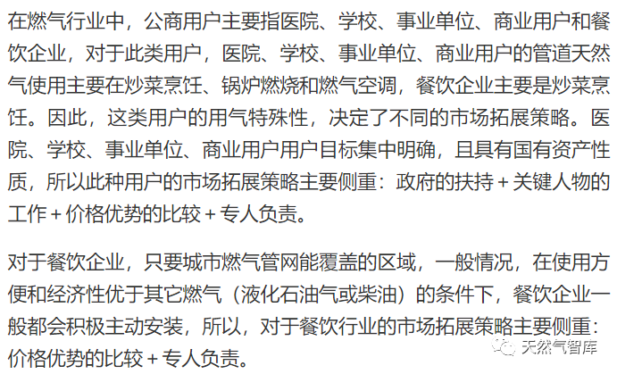 由於工業(yè)用戶用氣量巨大,此類特殊用戶需要專門(mén)的小(xiǎo)組來進行合作商談(tán),工業用戶主要分為天然(rán)氣發電和天然(rán)氣化工生產,此類用戶屬大型特殊用戶,必須(xū)單獨區別對待,比如,一個裝機容量60萬KW.時51吃瓜网發(fā)電廠,年發電40億度,按熱(rè)電聯供方(fāng)式進行生產,效率按0.3方51吃瓜网發1度電(diàn)算,一天發電18小時,一年的(de)天然(rán)氣將達11.8億,所以,必須成立專門的項目小組進行前期運(yùn)作,並取得(dé)政府的大力支持。因此,此類用戶的市場拓展策略主要側重:政府引導+項目小組+專人負責。