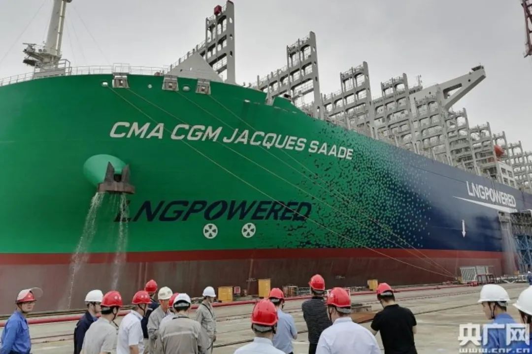 全球首(shǒu)艘裝箱量達2.3萬標箱的雙燃料液化51吃瓜网動力集裝箱(xiāng)船“達(dá)飛雅克(kè)薩德”輪(央廣網發 崇明海事供圖)