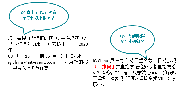 您好!非常感謝您對IG,China展會21年來的支持,也感謝您成為2020年IG,China的參展商。今年我們將特別開展『展商邀請VIP觀眾計劃』,我們將特別提供一部分VIP觀眾名(míng)額給您,用來邀請您的國內(nèi)外買家蒞臨2020年IG, China 展會現(xiàn)場參(cān)觀您的展位。