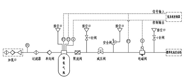 (9)減壓閥:將氫氣的壓力調節到燃料電池所需要的壓力。當出現異常情況,可以與(yǔ)針(zhēn)閥、安全(quán)閥聯動將氫氣瓶中的殘餘(yú)氫氣安全放空。
