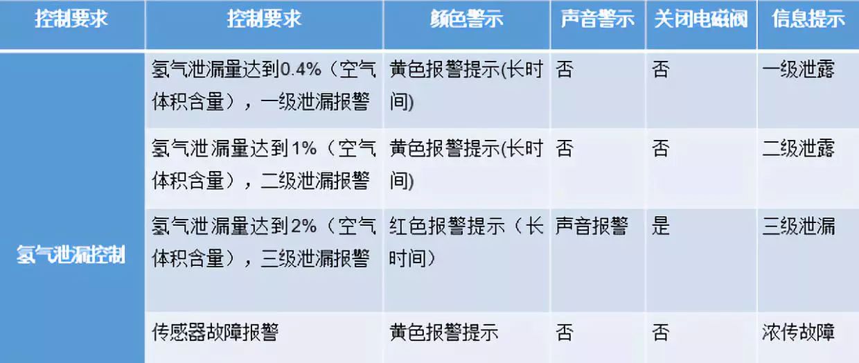 在儲氫瓶口(kǒu)、乘客艙(cāng)及燃料電池發動機係統易於聚集和泄漏處均放置多個氫(qīng)氣泄露傳(chuán)感器,實時監測車內的氫含(hán)量,一旦發生氫泄漏立即采(cǎi)取響應處置,確保乘客安全。而且當(dāng)有任何一個傳感器檢(jiǎn)測到的氫體積(jī)分(fèn)數超過氫爆炸下限(空氣中的氫體積含量為4%)的10%、25%和50%時,監控器會分別發出I級、II級、11I級聲光報警信號(hào)。具體控製措施,如表2-1所示。