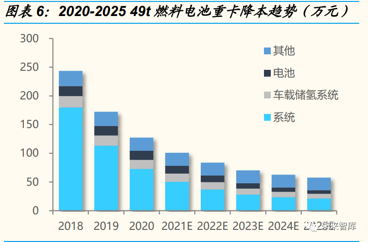 ◼ 第二階段:後補貼階段(2025 年以後):補(bǔ)貼階(jiē)段 FCV 產銷量將迅速(sù)擴張, 產業(yè)降本驅動力(lì)由“國產(chǎn)化”為主向“國(guó)產化+規模化(huà)”雙重(chóng)驅動轉變,燃 料電池核心部件、氫氣成本將快速下降。預計 2025 年前(qián)後,在國內氫氣 資源優勢(shì)地(dì)區,燃料電池(chí)整車有望實(shí)現全生命周期成本持平(píng)甚至低於燃油 車,屆時成(chéng)本成(chéng)為產業發(fā)展的主要推動,氫燃料電池產業將(jiāng)更加趨於市場 化(huà),加(jiā)速在重卡等商用車領域的替代進程,並向(xiàng)乘用車拓展(zhǎn),2030 年前後 整車市場規模達到(dào)百萬輛,市場規模達到萬億,係統(tǒng)成本降至 1 元/W 以下。