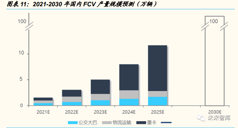 ◼ FCV 市場(chǎng)開啟放量,2030 年有望達到百萬產銷。政策正式落地將(jiāng)加速國 內 FCV 產銷,2025 年國內 FCV 產銷量有(yǒu)望突破十萬輛。規模化、國產化 推(tuī)動下,燃料電池成本將快速下降,補貼期末 FCV 將在部分地區實現無補(bǔ) 貼條件下對標燃油車平價,經濟性(xìng)優勢驅動下,FCV 將持續放量,2030 年 產銷規模達到(dào)百萬。