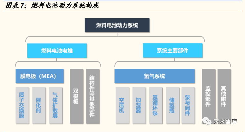  燃料電池主(zhǔ)要包(bāo)括電堆(duī)、氫氣係統,其中電堆以(yǐ)膜電(diàn)極(MEA)、雙極板 為主(zhǔ)。氫(qīng)氣係統以空壓機、增濕器、氫(qīng)循環泵、高壓氫(qīng)瓶(píng)為主。