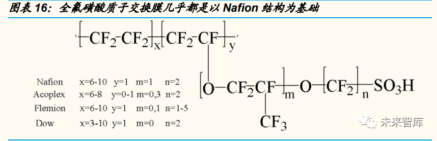 ◼ 全氟磺酸膜是主流質子交換膜。1)質子(zǐ)交換膜根(gēn)據含(hán)氟情況進行分類主 要包括全氟磺(huáng)酸膜、部(bù)分(fèn)氟化聚合(hé)物質子交換膜、複合質子(zǐ)交換膜和非氟 化聚合物質子交換膜。2)其中由於全氟磺酸聚合物具有聚四(sì)氟乙烯結(jié)構, 其碳-氟鍵的(de)鍵能高,使其力學性能、化學穩定性、熱穩定(dìng)性佳,使用壽命 遠好於其他膜材料的使用壽命,同時由於分子支鏈(liàn)上存在(zài)親水性磺酸基團, 具有(yǒu)優秀的離子傳導特性,全氟磺酸膜成為目前(qián)主流質子交換(huàn)膜方案(àn)
