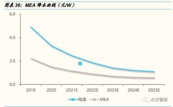  短期國產化、規模化將是降本的主(zhǔ)要(yào)推動,未來功率密度提升帶來(lái)更大降 本空間。國產化 MEA 產品規模化應用(yòng)增強供應商議價能力,大批量采購情 況下上遊原材(cái)料成本有望大幅下降,同(tóng)時規模效應攤薄高昂的設備投入, 帶動 MEA 成本下行。遠期(qī)看,MEA 功(gōng)率密度提升將降低單瓦(wǎ)材料用量, 實現更大(dà)的降本空間。