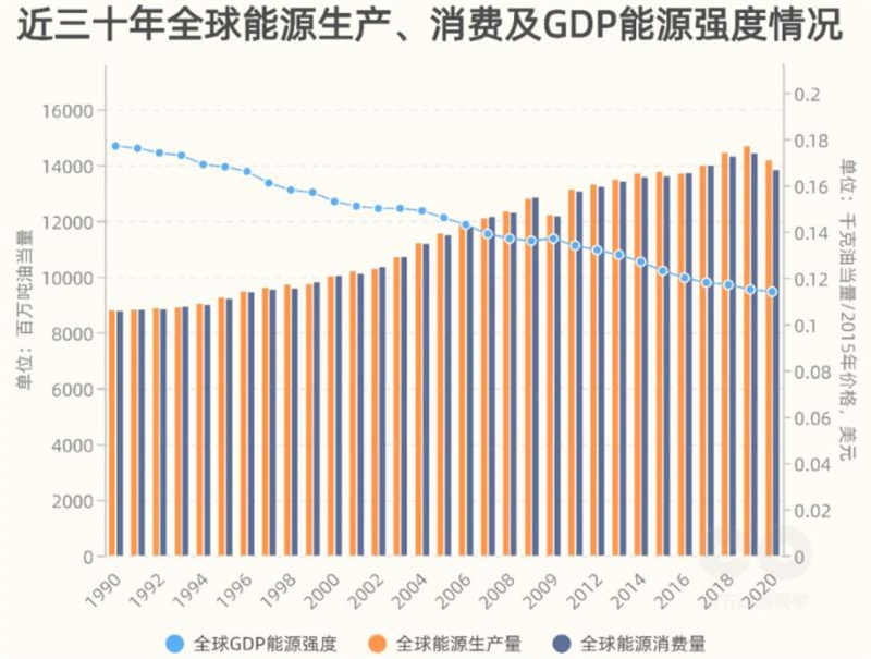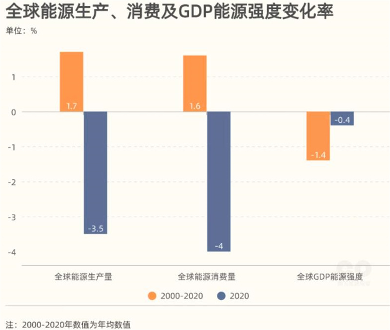 近三十年全球GDP能源強度(dù)總體呈下降態勢,2000-2020年年均下降1.4%。2020年全球能源強度下降0.4%,下降速度顯著放緩。