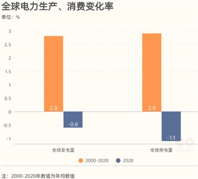 近三十年全球發用電量總體呈上升態勢,2000-2020年全(quán)球發電量年均增長率為(wéi)2.8%。2010-2019年全球發電量一直呈增長態勢,其中2019年增(zēng)速明顯(xiǎn)放緩,2020年呈下降態勢,降幅(fú)0.6%。2020年(nián)全球用電量下降1.1%,是2009年以來首次下降。