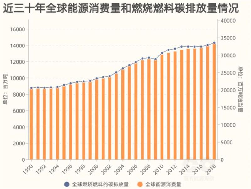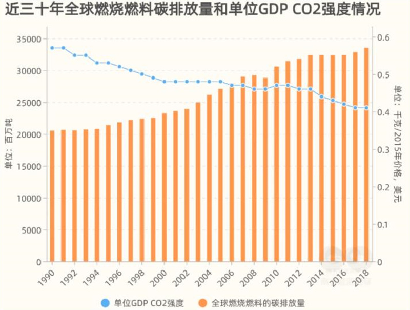 過去三(sān)十年,全球燃燒燃料產生的碳(tàn)排放量呈上(shàng)升態勢,與能源消(xiāo)費量正相關。與(yǔ)碳排放量相反(fǎn),單位GDP二氧化碳強度總(zǒng)體呈下降態勢,1990-2018年下降約28%。