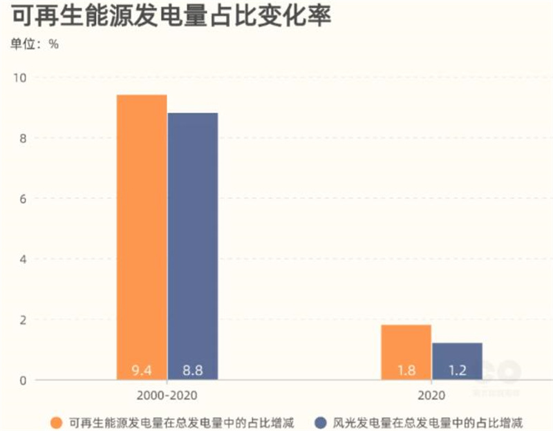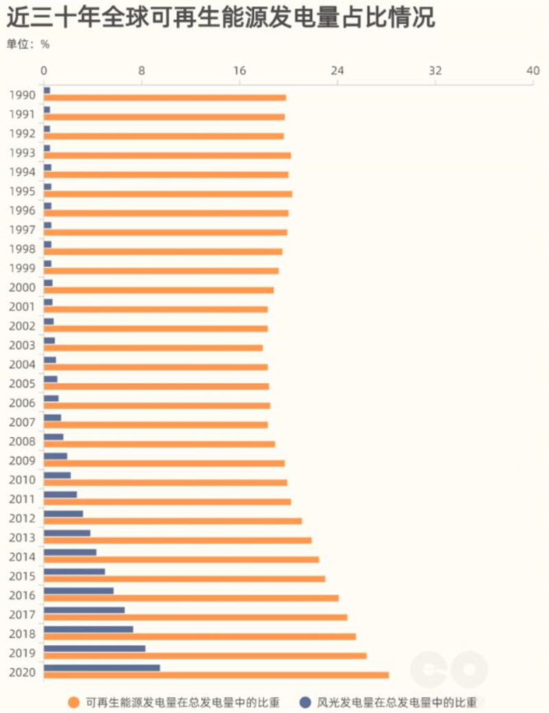 在21世紀第二個(gè)十年,全球可再生能源發電(包括水電,下同)比例有較明顯的增長,十年間共增長(zhǎng)了8個百分點,年均增長0.84%。2020年(nián)占比為28.2%,比2019年上升1.8個(gè)百分點,為近三十年(nián)最大增幅(fú)。
