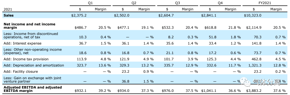 在GAAP的基礎上,持續經營調整後的每股收益為9.02美元,比上年(nián)增長8%,調整後EBITDA(息稅折舊攤銷前利潤)為38.83億美元,比上年增長(zhǎng)7%。在第四季度,空氣產品公司報告的GAAP淨收入為6.19億美元,比上年增(zēng)長25%,GAAP淨收入利潤率為21.8%,增長50個基點。空氣產(chǎn)品公司(sī)報告持續經營業務(wù)的(de)GAAP每股收益為2.51美元(yuán),比上年增長15%。由於銷量增(zēng)加9%、能源成本增加8%、定(dìng)價增加3%和有利的貨幣增加2%,第四季度銷售額增長(zhǎng)22%,達到28.41億美元。氫氣和商業需求的改善(shàn)以及(jí)新資產的增加(jiā),抵消了中國潞安工廠貢獻的減少。在美洲地區(qū)——銷售額為11.15億美元,比上年增長22%,主要受氫氣和商業需求的推(tuī)動,能源成本增加15%,定價增加4%,銷量增加3%。營業利潤為2.9億美(měi)元,增長了22%,這得益於更高的交易量、定價和(hé)更低的維護成本;調整後的EBITDA為4.76億美元,增長16%。營業(yè)利(lì)潤率為26%,下降了20個基點。調整(zhěng)後的EBITDA利潤率(lǜ)為42.7%,下降了230個基(jī)點,因為更高的能源成本帶來的大約550個基點的負麵影響(xiǎng)被成本降低和股權附屬收入增(zēng)加部分抵消。在歐洲、中東和非洲——銷售額為6.74億美元,同比增長33%,銷量增長14%,主要受氫氣(qì)和商業需求以(yǐ)及新資產的推動;能源成本增加12%,定價增加(jiā)4%,有利的貨幣增加3%。營業利潤為1.36億美元,增長了11%,這是由於銷量增加、定價和有利(lì)的貨幣(bì),部分被本季度(dù)的能源成本上漲所抵(dǐ)消;由於(yú)這些相同的因素以及更高的股權附屬收入,調整後的EBITDA為2.29億美元,增長了14%。營業利潤率為20.2%,下降420個基點。調整後的EBITDA利潤率為(wéi)34%,下降(jiàng)了560個基(jī)點,較高的能源(yuán)成本約占下(xià)降的(de)400個基點。在亞洲地區——銷售額為 7.54 億美元,比上年增長6%,受(shòu)益於5%的有利貨(huò)幣和1%的定價。銷量持平,新工廠抵消了潞安的(de)貢獻減少。營業利潤為2.06億美元,下降了2%,因為有利的定價和貨幣被更高(gāo)的成本所(suǒ)抵消,營業利潤率為27.3%,下降了220個基點。調整後的(de)EBITDA為3.41億美元,增長3%,因為有利的定價和(hé)貨幣抵消了更(gèng)高的成本(běn)。調整後的EBITDA利潤(rùn)率(lǜ)為(wéi)45.3%,下降了100個基(jī)點。空氣產品公司預(yù)計2022財年全年的資本支出為(wéi)45-50億美(měi)元。美國空氣產品公(gōng)司首席執行官Seifi Ghasemi表示:“空氣產品公司忠誠、敬業和積(jī)極的團隊再次證明(míng),他(tā)們現在可以在開發和(hé)執行大型項目(mù)以實現未來盈利增長的同時取得成果。盡(jìn)管麵臨巨大的外部挑戰,我們還是(shì)在這一年取得了優異的成績。我們宣布了核心氣化、碳捕獲和氫增長平台的重大項目,包括加拿大艾伯塔(tǎ)省的淨零氫設施和路易斯安(ān)那州的大(dà)型藍氫(qīng)項目,同時還完成了對吉讚120億美元的收購。”