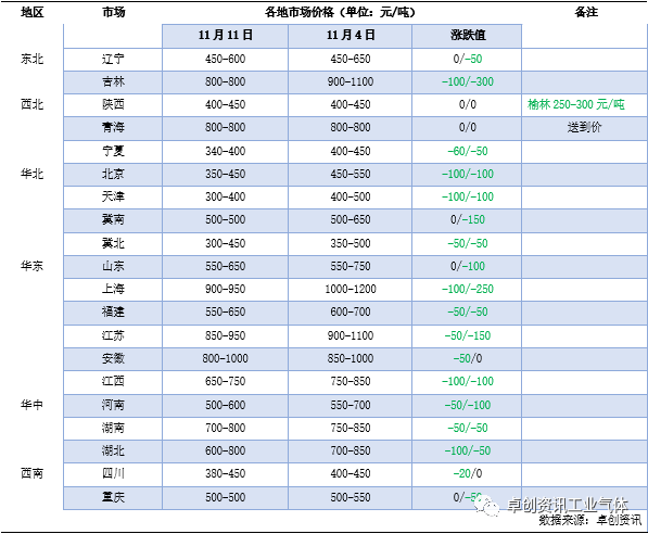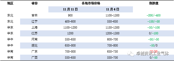 11月第2周本(běn)周液氧市場跌勢難改。隨著天氣(qì)轉涼,北方(fāng)雨(yǔ)雪天氣,終端需求跟進不足(zú),市場情緒偏悲觀,廠商跟隨市場節(jiē)奏低價出貨為主,價格重心不斷下移。南方地區同樣需求有限,市場呈(chéng)現供大於求局麵,價格弱勢下挫。據卓創資訊數據監測,截至本(běn)周四中(zhōng)國液(yè)氧市場均價611.5元/噸,環比上周(zhōu)降6.9%,同比漲0.2%。