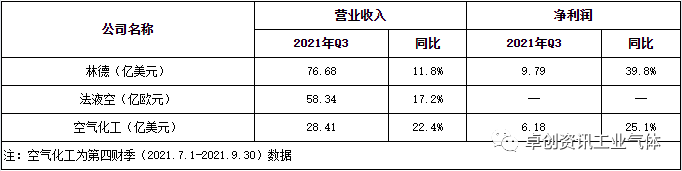 林德集團三季度收入為76.68億美元,同比增長11.8%。其中(zhōng)價格上(shàng)漲3%,銷量增加貢獻(xiàn)了8%,主要是受終(zhōng)端市場(chǎng)需求增加支撐;疊加各部門(mén)生產力持(chí)續提升,淨利潤實現9.79億美(měi)元,同比增長39.8%。 分區域來看,美洲地區收入為30.91億美元,同比增加17%,主要是下遊終端市場需求(qiú)良好及新(xīn)項目(mù)啟動支撐;非洲、中東(dōng)及歐洲收入為19.11億美元,同比增長18%,價格與銷量均有提升;亞太地區收入為15.64億美元,同比增長5%,受多數終端市場需求增加支撐,業績較二季度亦有增長。法液空2021年第三季(jì)度延續了上半年的(de)增長勢頭,收入為58.34億歐(ōu)元(yuán),同比增長17.2%,主要受益於公司穩(wěn)健的業務模(mó)式及能源價格的上漲。季度內電子行業的發展(zhǎn)勢頭、工(gōng)商戶業務的持續複蘇以及醫療保健業務的穩健發展均利好氣體服(fú)務模塊的業績提升。 2021年(nián)三季度法液空氣體板塊收入達55.85億歐元,同比增加16.9%。從(cóng)各區域來(lái)看(kàn),均有不同程度的同(tóng)比增長。美洲和歐洲為主要業務地區,其中美洲收入達21.44億歐元,同比增長11.9%。受鋼鐵、化工和煉油市場強(qiáng)勁需(xū)求支撐(chēng),大型工業(yè)同比增長7.4%;通用工業繼續(xù)複蘇,同比增長7.5%;電子產品(pǐn)銷售增長了6.6%,醫(yī)療健康領域(yù)同比增長(zhǎng)14.5%,尤(yóu)其是拉丁(dīng)美洲的醫院(yuàn)護理(lǐ)和家庭保健業務的銷售額增長明顯。歐洲地區收入為20.38億歐元,同比增長26.2%,大工業及通(tōng)用工業、醫療等方麵均實現同(tóng)比正增長,其中哈薩克斯坦和俄羅斯均有新(xīn)裝置(zhì)投用。亞太收入(rù)為(wéi)11.97億歐(ōu)元,同比增加8.7%;受中國配套企業開工下(xià)降影響,大工業同(tóng)比下降5.5%,而受(shòu)中國市(shì)場交(jiāo)投良好及亞洲其他市場複蘇(sū)支撐,通用工業同比增長8.3%,電子行業同比增長(zhǎng)10.8%。中東及非(fēi)洲地區同比增長42.2%,其中沙特阿拉巴氫氣需求持續複蘇,且剛收購完成16個薩索爾空分(fèn)也(yě)作出了貢獻。空氣產品(pǐn)公司(sī)第四財季營業收入達28.416億美元,同比增長22.4%,其中銷(xiāo)量增加了9%,能源成本增加了8%,定價增加(jiā)了3%,貨幣優惠增加了2%。氫(qīng)氣的(de)改善、商業需求及新資產帶來(lái)的產量增(zēng)長超(chāo)過了中國(guó)潞(lù)安工廠減少的(de)貢獻。 從各區域來工(gōng)業氣體收入來看,受氫(qīng)氣和工商業需求推(tuī)動(dòng),美洲地區達11.15億美元,同比增長22%;亞洲收入(rù)為7.54億美元,同比增長6%,貨幣優惠5%,價格上漲1%,產量持平,新工廠抵消了潞安的(de)減(jiǎn)產。歐洲、中(zhōng)東及非洲地區收入(rù)為6.74億美元,同比增長33%,銷量增長14%,主要受氫氣(qì)、商業需求和新資產的推動,能(néng)源成本增加12%、提(tí)價4%,還有3%的貨幣利好。 對於未來發展,各(gè)公司信心(xīn)滿滿。林德表示2021全年稀釋後的每股收益在將在(zài)10.52-10.62美元(yuán)之(zhī)間,較上年同期增長28%-29%;法液空目前投資已達到33億歐元,其中超過40%的(de)投資與能源轉型有關(guān),未來其有(yǒu)信心在2021年進一步提高營(yíng)業利潤率,並在恒定匯率下實現經常性(xìng)淨利(lì)潤增長;空氣產品公司2022財年全年調整後每股收益指導為10.20美元至10.40美元,較上年調整後每股收益增長13%至15%。對於2022財年第一季度,Air Products的調整後每股收益指導為2.45美元至2.55美元,較2021財年第一季度調整後(hòu)每股收益增長16%至20%。