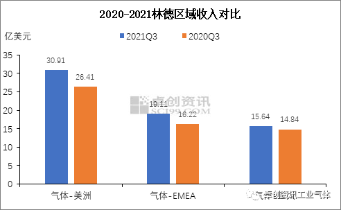 [導語] 2021年三季(jì)度三大(dà)外資工業氣體公司均延續上半年的增長態勢,整體業績表現良好,均實現同比正增長。 三季度受大宗商品價格(gé)上漲(zhǎng)及(jí)全球市場持續複蘇支(zhī)撐(chēng),美洲(zhōu)、歐洲、亞太、中東等地區工業(yè)氣體均顯尚可,三大(dà)外資工業氣體公司在各區域的收入均同比(bǐ)有所增長,且對後市充(chōng)滿了信心。2021年(nián)Q3國際氣(qì)體(tǐ)公司業績表