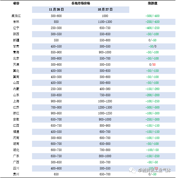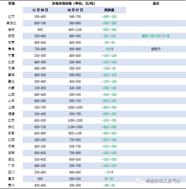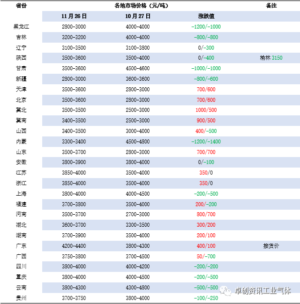 11月液氧市場弱(ruò)勢調整。進入市場淡季,液氧需求疲軟難振,市場資源供給(gěi)充裕,供大於求局麵下,液氧價格重(chóng)心不斷下移。月中旬(xún),隨著天氣轉涼,北方雨雪天氣,交投受阻,市場情(qíng)緒偏悲(bēi)觀,廠(chǎng)商跟隨市場節奏低價出貨為主。南方地區需求有限,交投積極性一般,價(jià)格弱勢下(xià)挫。月底,華北地區空(kōng)分(fèn)負荷下降,供給收緊,局部低價(jià)窄(zhǎi)幅(fú)反彈。截止到11月26日,卓創資訊液氧均價591元(yuán)/噸,較上(shàng)月均價降22.03%,較去(qù)年同期降3.56%。