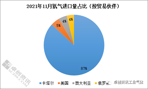數據顯示,11月份中國氦氣自卡塔爾、美國、俄羅斯進口量增加,澳(ào)大利亞進口量與上月相比有減少。具體來看,自(zì)卡塔爾地區進口270.97噸,占比87%。美國進口量15噸,占比5%,較10月增加59.57%。澳大利亞進口量13.71噸,占比4%。俄羅斯(sī)進口量12.14噸,占比4%,較10月(yuè)略增。