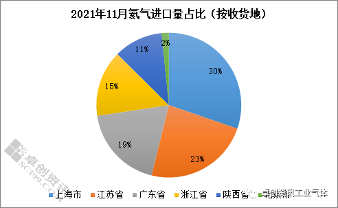 數據(jù)顯示,11月(yuè)份氦氣進口主要集中在上海、江蘇、廣東(dōng)、浙江、陝西以及北京等地,其中上海共進口94.44噸,占比30%,排名第一。江蘇進口73.46噸,占比23%。廣東進口58.56噸,占比19%。浙江占比(bǐ)15%,陝西占(zhàn)比11%,北京(jīng)市占2%。