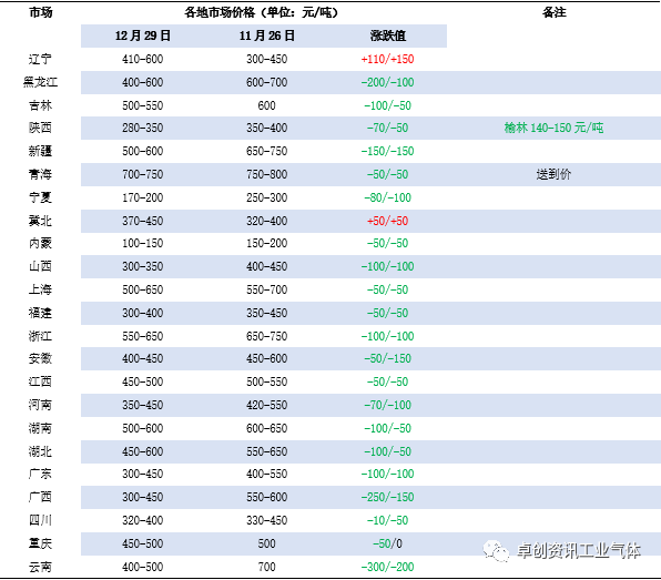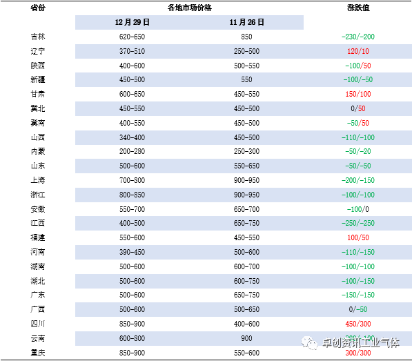 12月液氧市場跌多漲(zhǎng)少。12月份以來,受到經濟穩增長預期、成本(běn)上漲以及淡季需求(qiú)回暖的共同影響,國內(nèi)鋼材市場(chǎng)呈現震(zhèn)蕩反彈的走勢,然液氧(yǎng)需求無明顯好轉,市場(chǎng)暫無(wú)大量收貨,資源呈現供大於求局(jú)麵,出貨壓力(lì)下,價格重心不斷下(xià)移。其中北方多地由於空分負荷不高,液氧供給減少(shǎo)支撐下,低位窄幅反彈,但空間有限(xiàn)。截止到12月29日,卓創資訊液氧均價462元/噸,較上月均價降20.21%,較去(qù)年同期降18.52%。