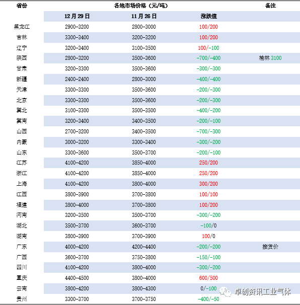 本月液(yè)氬市場價格漲後(hòu)降,較上月收盤漲跌(diē)不一。中(zhōng)旬前(qián),市場供應麵支撐下,各地(dì)交(jiāo)投多顯平穩,價格(gé)持續上漲,其中月初反彈態勢較為明顯,後逐步放緩。中旬後下遊接貨逐(zhú)漸減弱,疊加節日氛圍影響,局部高價承壓有(yǒu)所鬆動,月底跌勢(shì)擴大至全國。根據卓創資訊數據顯示,截至12月(yuè)29日液氬月均價為3980元/噸,較上(shàng)月(yuè)收盤均價上(shàng)漲23.4%,較去年12月均價上漲168%。