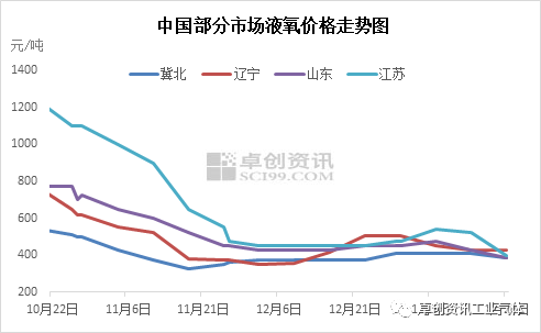 1月以(yǐ)來,液氧市場多偏弱震蕩,期間雖有短時反彈,但由於實(shí)質性需求跟進有限,價格弱勢下挫為主。遼寧地區隨著本鋼、鞍鋼等主力(lì)企業分銷,市場供給增量明顯,需求偏(piān)弱下(xià),價格震蕩下行,主流出廠(chǎng)降至400-450元/噸,環比上月降15.84%。唐山地區管(guǎn)控(kòng)放鬆,空分(fèn)負荷有明(míng)顯提升,液氧供給增量,但(dàn)市場暫無大量收貨,出貨承壓下(xià),液氧價格弱勢下挫,冀北(běi)主流出廠降至280-450元/噸,環(huán)比上月降10.98%。山東膠東地區元旦節後,交投(tóu)氛圍有好轉(zhuǎn),價格(gé)漲(zhǎng)至400-550元/噸,但隨著交投氛圍下滑,出貨有放緩,價格弱勢下挫,主流出廠降至350-420元/噸。江蘇地(dì)區采(cǎi)購積極性有限,局部出貨承壓,以價換量出貨為主,今日主流出廠降至350-450元/噸,月環比降15.79%。