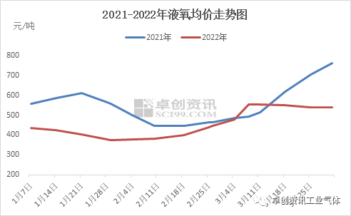 [導語]2022年一季度中國液氧市場呈(chéng)“跌-漲-跌”走勢,各月(yuè)走勢不同。據卓創資訊監測,一季度全(quán)國液氧均價450.94元/噸,同比降41.26%。