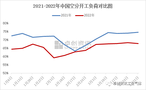 據卓創資訊數據監測,2022年一季度末中國空分開工率在67.69%,較去年同(tóng)期下滑(huá)6.9個百分點。今(jīn)年一季度中國空分開工負荷(hé)率均低於去年同期,主要因為需求不及預期。1月份,液(yè)氧需求無明顯增量(liàng),空分開工負荷率維持6成(chéng)左右水平,2月春節假(jiǎ)期影響下,多數全液化空分停車,配(pèi)套空分亦有不同(tóng)程度降負,空分開(kāi)工負荷率降(jiàng)至季度內低點。節後,隨著複工複產(chǎn)推進,空分開工負(fù)荷逐漸提升,但3月下旬,多地運力受(shòu)阻,廠(chǎng)商出貨承壓下,空分開工負荷率有(yǒu)所下滑。