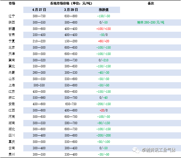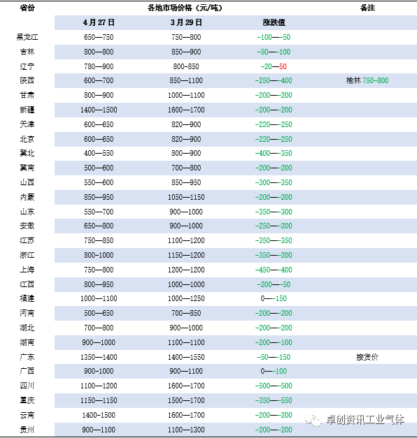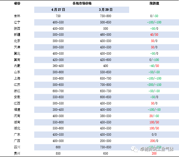 4月液氧市場以跌為主,個別地區反彈。月初(chū),華北和西北局部需求好轉,采購積極性提升,價格穩中(zhōng)上行。其餘市場表現(xiàn)平平,高價下調。中旬,安徽地區鋼廠收貨支撐,本地(dì)及河南(nán)局部略好,但資源流通範圍有限,其他地區價格承壓。月下旬(xún),寧夏和山西地區(qū)氛圍好(hǎo)轉,成交有(yǒu)所放量(liàng),價格偏強整理。其餘地區受需求萎靡不振(zhèn)以(yǐ)及後市預期偏(piān)悲(bēi)觀(guān)影(yǐng)響下,氛圍較(jiào)弱(ruò),價格重心進一步下調。截至4月27日,卓創資訊液氧均價519元/噸,較(jiào)上月均價降2.62%,較去年(nián)同期降39.75%。