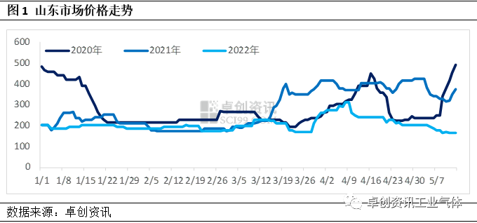 河北市場油田對二氧化碳的需求量較大,日均需求量超過900噸,在連續注井的帶(dài)動下,河北市場(chǎng)價(jià)格易漲難跌。但2022年由(yóu)於運輸(shū)長期受限,油田(tián)需求出現缺口,唐山地區暫停外采,氣站等(děng)終端也接貨困難,導致需求不及預期,生產廠家庫存(cún)普遍高位,紛(fēn)紛降低生產負荷,市場日產量最低曾降至1000噸左右,市場價格亦長期低迷。4月份隨著運力恢(huī)複,市場價格逐步複蘇,在唐(táng)山地區油田需(xū)求(qiú)恢複後(hòu),價格快速反彈至300元/噸左右,但隨後唐山(shān)地區運力再度受限,疊加邢台建滔化工裝置檢修,需求下降導致市場價格再度(dù)下(xià)跌。