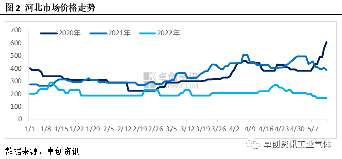 從上圖中可以看到,2020與2021年河北二氧化碳市場一季度市場均價均(jun1)在300元/噸附近(jìn)運行,並在4月(yuè)份上漲至400元/噸左右,但(dàn)2022年開年河北均價在回(huí)落到200元/噸左右後(hòu)便再未出現大幅上漲,並在5月份繼續下跌至年內新低的165元/噸。卓創資訊認為,雖然前期產能大幅增長,導致(zhì)供強需弱,壓製了市場價格的上漲,但最主(zhǔ)要的則(zé)是2022年市場需求不及預期,導致市場價格難有起色,廠(chǎng)家出(chū)貨承壓,並導致價(jià)格與生(shēng)產負荷均在低(dī)位運(yùn)行。