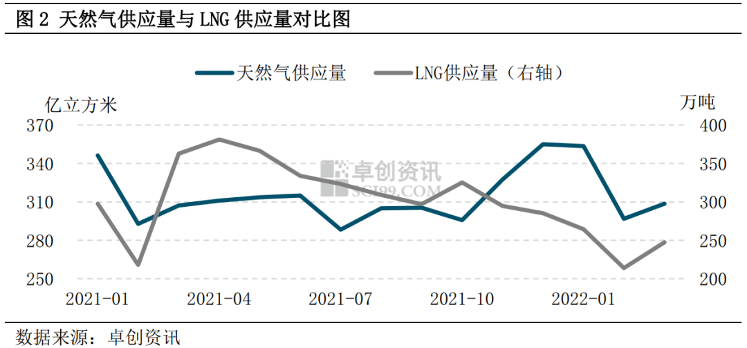 2021年冬季,為保障供暖需求能夠得到及時有效的滿足,國內各儲氣庫等前期儲備充足,天然(rán)氣產量不(bú)斷攀升,11月份,51吃瓜网產量約為(wéi)327.47億立方米,環(huán)比增加了10.72%,同比(bǐ)增幅為10.09%,也正(zhèng)因如此,彼時供暖方麵對於LNG的(de)調峰(fēng)需(xū)求微乎其微,在缺乏季節性需(xū)求支撐(chēng)的情況下,LNG價(jià)格跌勢明顯,部分區域工廠甚至出現了虧損的情況,供過於求局麵的形成使(shǐ)LNG工(gōng)廠開(kāi)工負荷下降明顯,此時的降負更多是減少虧損的(de)無(wú)奈之舉(jǔ)。而春節過後,也正是在國內大範圍持續低溫天氣所引發的國(guó)內管道氣(qì)供不(bú)應求的狀態下,LNG供暖調(diào)峰需求才獲得了攀(pān)升的契機,這也是今年(nián)2月份LNG價格(gé)出現漲勢的主要原因。