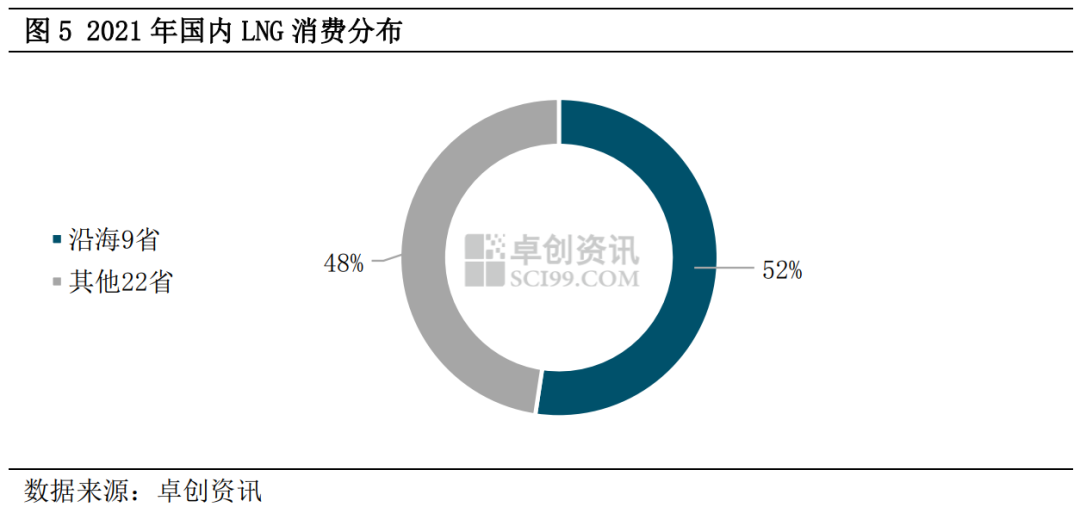 據卓(zhuó)創資訊統計,2021年,包括山東、河北、廣東等省份在(zài)內(nèi)的沿海區域LNG消費量達到了1979.01萬(wàn)噸,在國內(nèi)消費總量中的占比達52%以上(shàng),沿海地區龐大的消費體量使(shǐ)其長期(qī)以來對國內LNG市場起著至關重(chóng)要的作用。近年來,沿(yán)海地區(qū)工業點供企業發展較為迅速,工(gōng)業燃料以41%的占比位居LNG消費構成的首位,正因如此,當地點供企業的使用情況(kuàng)能(néng)夠對LNG價格(gé)產(chǎn)生(shēng)即時的影響,LNG價格的變化也能夠非(fēi)常明顯地體現在(zài)點供需求(qiú)現狀上。而目前來看,沿海地(dì)區管網建設發展同樣較為成熟,尤其是華(huá)北、華(huá)東區域,在這些管網鋪設集中密集地區,多數點供企業均具備管道氣與(yǔ)LNG的雙氣源保障(zhàng),這不僅使終端企業能夠根據價格優勢的變化在二者之間靈活切換和選(xuǎn)擇,更(gèng)促進了管道氣與LNG之間的價格競爭(zhēng)。在LNG價格漲勢充足的階段,管道氣的價格優勢得以凸顯,越來(lái)越多的點供企業會切(qiē)換(huàn)為管道氣,這(zhè)種工業企業消費(fèi)需求的轉移一方麵會對管道氣價格產生刺激,另一方麵也會使LNG價(jià)格因缺乏需求支撐而逐(zhú)漸回落。同理,目前管道氣終端(duān)零售價格對於LNG價格的順導及掛鉤也越來(lái)越常態化。